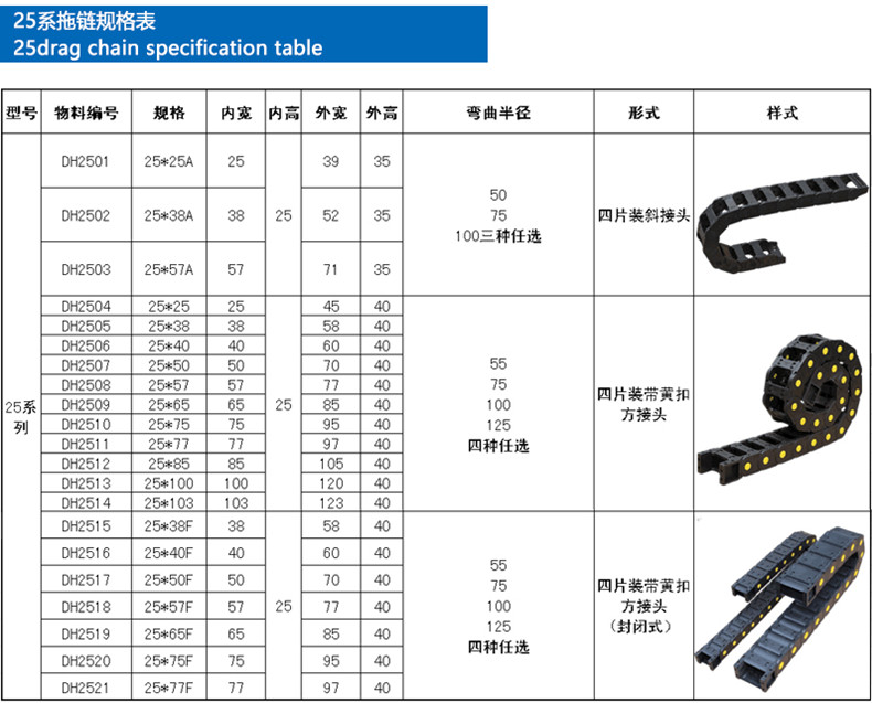 應用分類:適用于在反復運動的場合,能夠對內置的電纜、油管、氣管、水管起到牽引和保護作用。常應用于數(shù)控機床、電子設備、石材器械、玻璃機械、門窗機械、注塑機、機械手、起重運輸、自動化倉庫等。