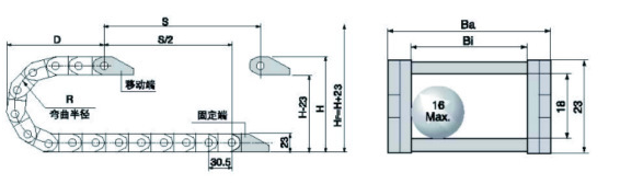 內高:選擇內置電纜、油管、氣管、水管等中最粗的一根作為參考高度,加上至少10%的高度空間作為拖鏈內高Hi.如果重疊按重疊后實際高度作為參考高度。