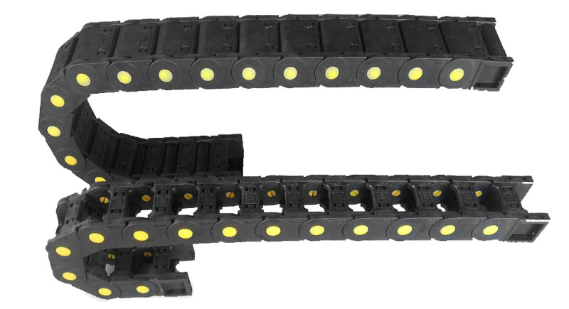 內高:選擇內置電纜,油管,氣管,水管等中粗的一根作為參考高度,加上至少10%的高度空間作為拖鏈內高。如果重疊按重疊后實際高度作為參考高度。內寬:選擇較粗的一些電纜,油管,氣管,水管等,其外徑之和作為拖鏈內寬的參考,并留有至少10%的寬度空間。彎曲半徑:選擇內置電纜,油管,氣管,水管等中的彎曲半徑作為參考值,并留有10%以上的空間。