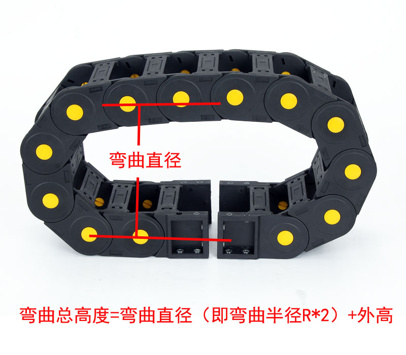 本公司每個(gè)規(guī)格的拖鏈都有多種彎曲半徑可供客戶選擇(彎曲半徑不影響價(jià)格),大家選擇的時(shí)候需要注意所需要保護(hù)的電線電纜的一個(gè)彎曲度,另外就是拖鏈安裝在機(jī)械上所預(yù)留的一個(gè)安裝空間高度,一定要高于拖鏈的彎曲總高度。拖鏈彎曲總高度=拖鏈彎曲半徑*2+外高。如對(duì)此選擇還有什么疑惑的大家可以隨時(shí)聯(lián)系我們的客戶,我們會(huì)根據(jù)我們的專業(yè)知識(shí)給您一個(gè)合適的建議。