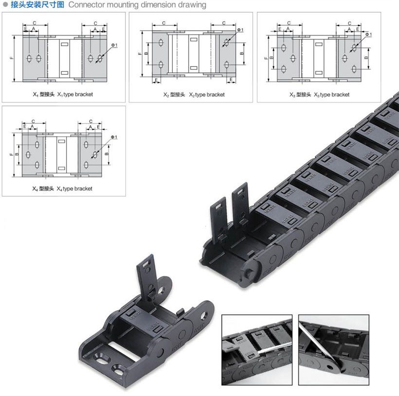 25系列半封閉塑料拖鏈安裝尺寸圖: